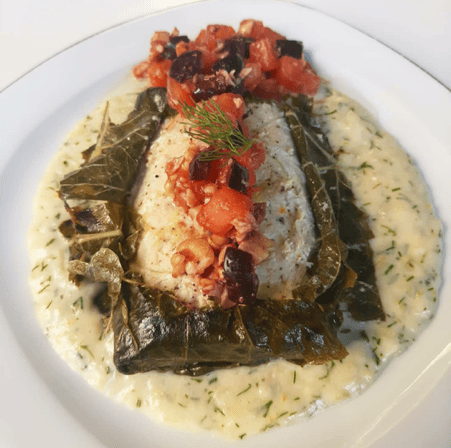 - Cut the Mackerel wrapped in grapevine through the middle and place it on top of the sauce.